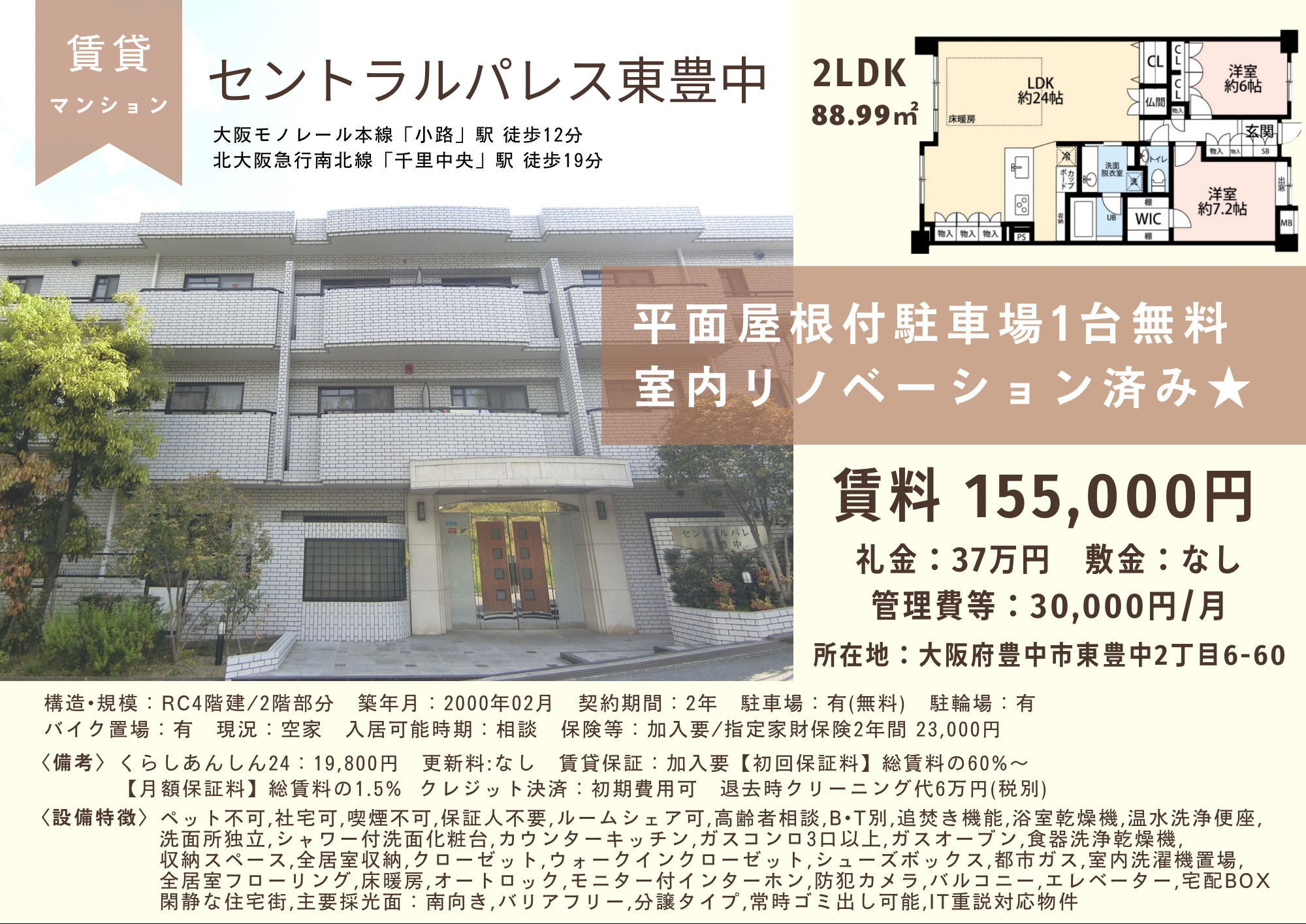 【豊中】 ★2LDK ★賃料15,5000円 ★平面屋根付駐車場1台無料 ★室内リノベーション済 ★大阪モノレール本線「小路」駅 徒歩12分 北大阪急行南北線「千里中央」駅 徒歩19分